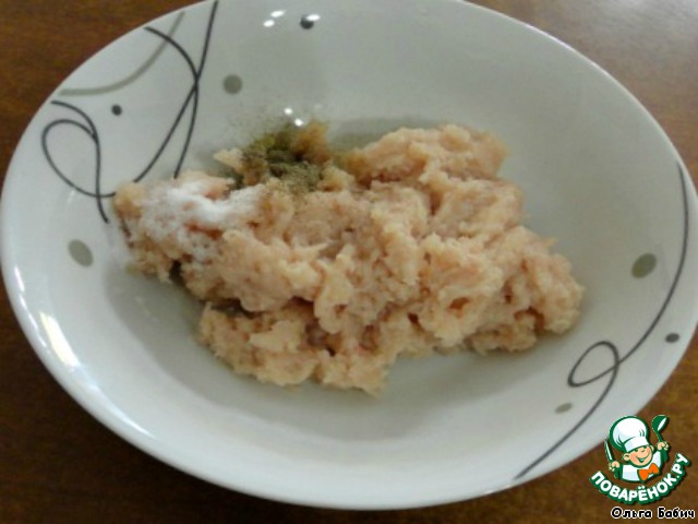 Куриное мясо перемолоть вместе с луком в блендере или 2 раза пропустить в мясорубке.