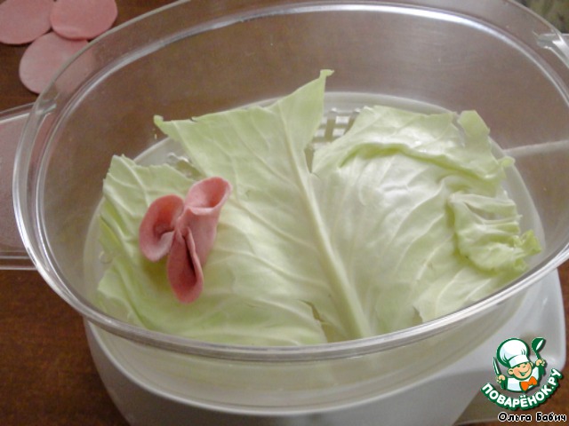 Укладываем в пароварку на листы капусты, чтобы пельмени не прилипли.