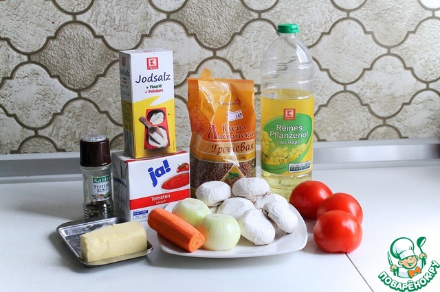 Вот весь список продуктов наглядно. Тут нет зелени, поскольку она у меня была замороженная. В принципе, ее можно и не добавлять, но на мой взгляд немножко все же не помешает. Как видно на фото, морковь, лук и грибы уже подготовлены. С грибов я как обычно просто сняла шкурку (или как там она называется) и совсем их не мыла.