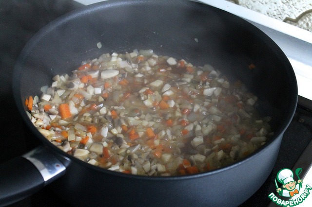 Добавляем грибы и тушим 2 минуты (огонь можно немножечко уменьшить). У меня были шампиньоны, но я думаю, что с другими ароматными грибами (типа белых) выйдет не хуже (а может и даже лучше!).