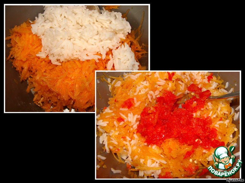 Отваренный в соленой воде рис смешать с тертой на крупной терке сырой тыквой.