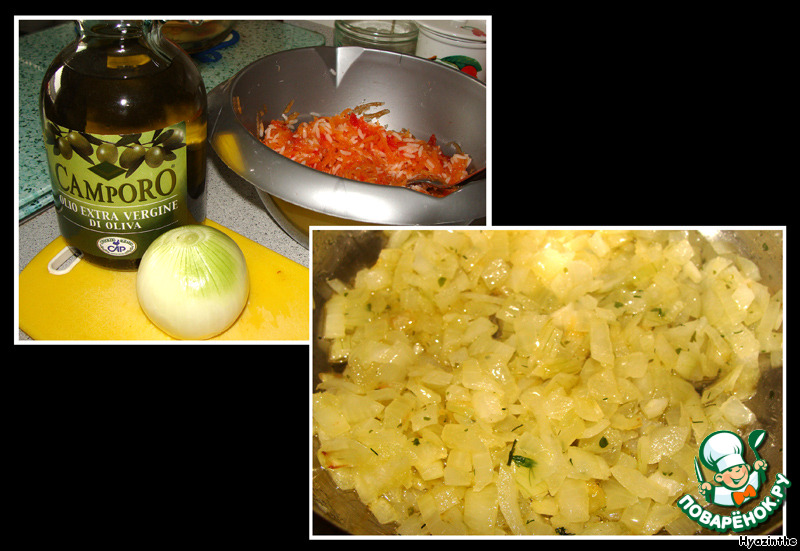 Лук почистить, мелко нарезать, потушить в оливковом масле до легкой желтизны.