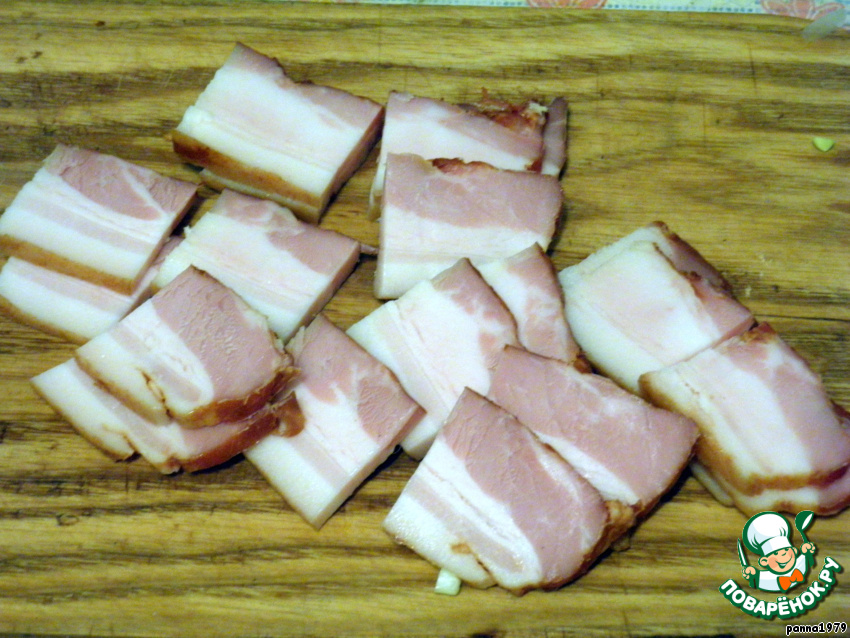 Грудинку, бекон или сало (я использовала копченую грудинку) нарезать небольшими кусочками.