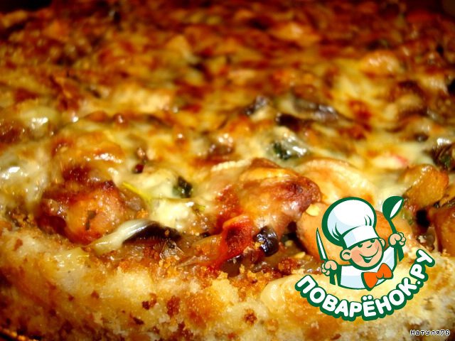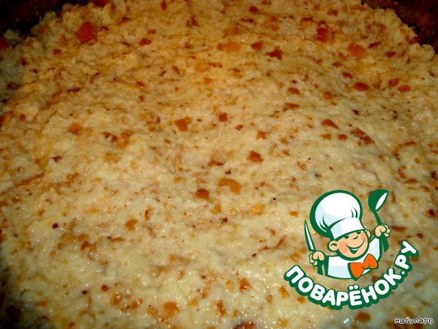 Батон размачиваем в молоке, добавляем яйцо, хорошо вымешиваем. Форму смазываем маслом, выкладываем массу в форму, делая небольшие бортики.