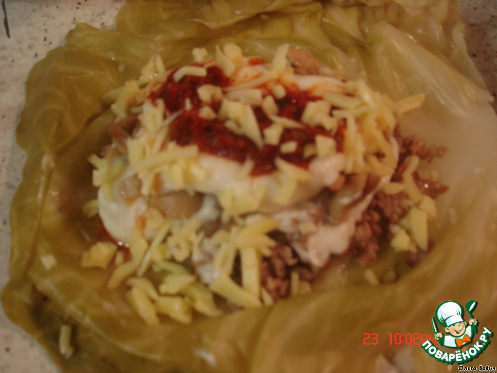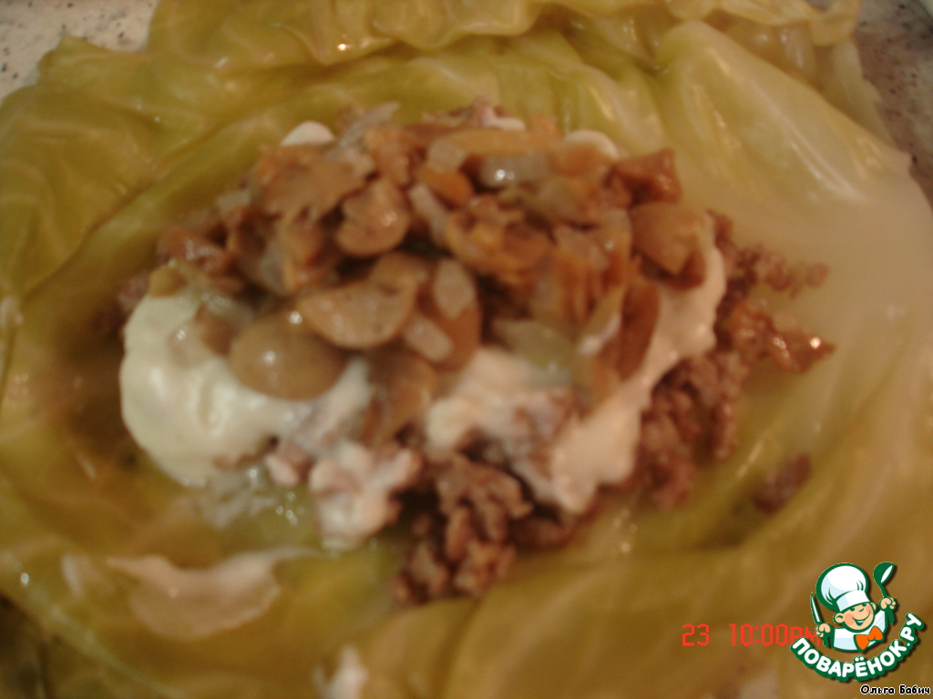 Капустные листья отварить, фарш прожарить с луком 1 шт.,