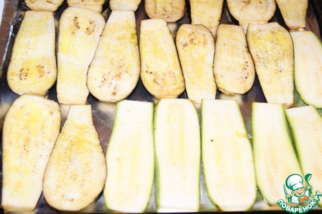 Баклажаны и цукини нарезать вдоль толщиной 1 см и выстелить на противень, застеленный пекарской бумагой или фольгой. Смазать оливковым маслом (3 ст. л.) и запекать в прогретой до 190"С духовке минут 10-12. Ориентируйтесь на вашу духовку.