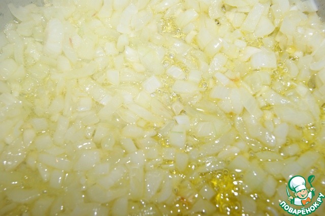 Мелко нарезанные лук и чеснок тушим 2-3 мин. в оставшемся масле.