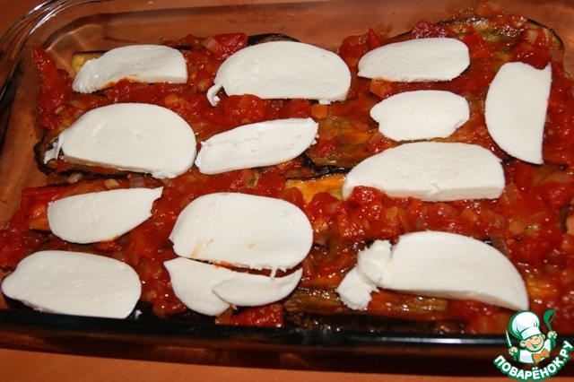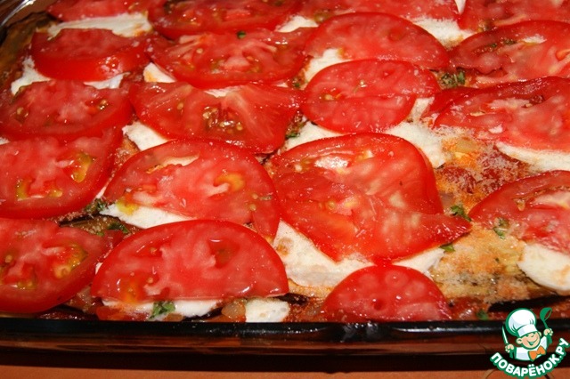 Третий слой из баклажанов - подготавливаем также как и первый. Можно сверху, как и я, выстелить тонко нарезанные дольки помидора.