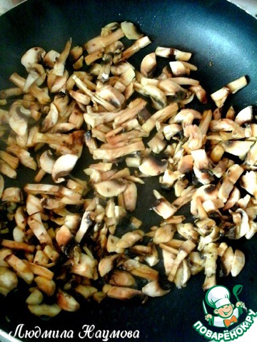 Для начала помоем и почистим грибы, нарежем тонкими полосочками и обжарим в небольшом количестве растительного масла.
