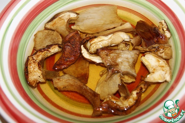 Замочить грибы в горячей воде на 1 час, затем отжать.