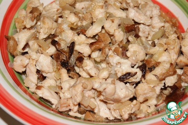 Нарезать мелко филе, гибы, лук и чеснок, обжарить в 2 ст. л. масла, посолить и поперчить. Остудить.