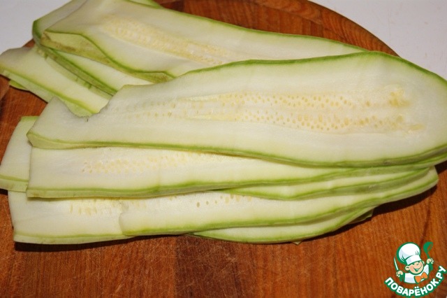 Кабачки нарезать вдоль очень тонкими пластинами.