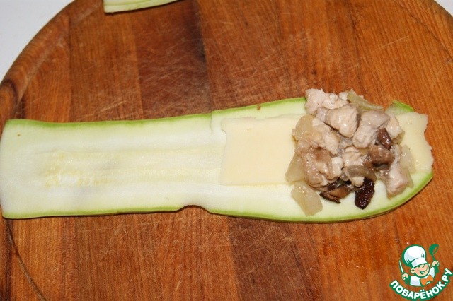 На кабачок поместить кусочек сыра (можно на всю длину, если не считаете калории), начинку и свернуть рулетом.
