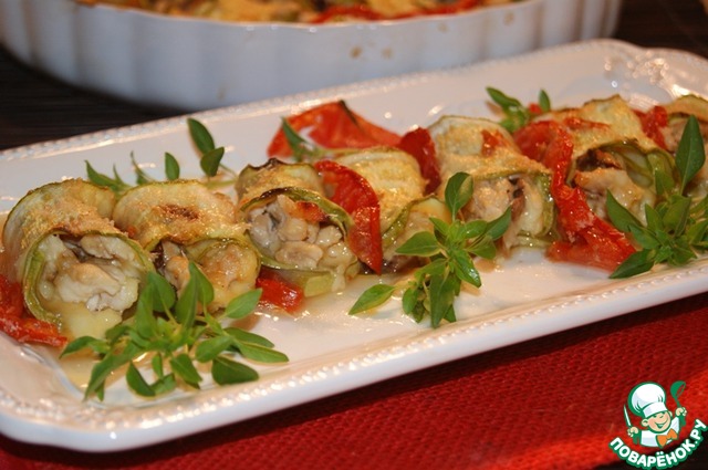 Рулетики из кабачков с сыром, курицей и белыми грибами