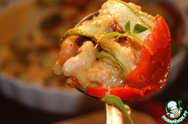 П. С. не нужно заливать блюдо никаким бульоном или водой! Кабачки и помидоры при запекании выделят достаточно сока, который смешается с расплавленным сыром и превратится в очень вкусный соус!
