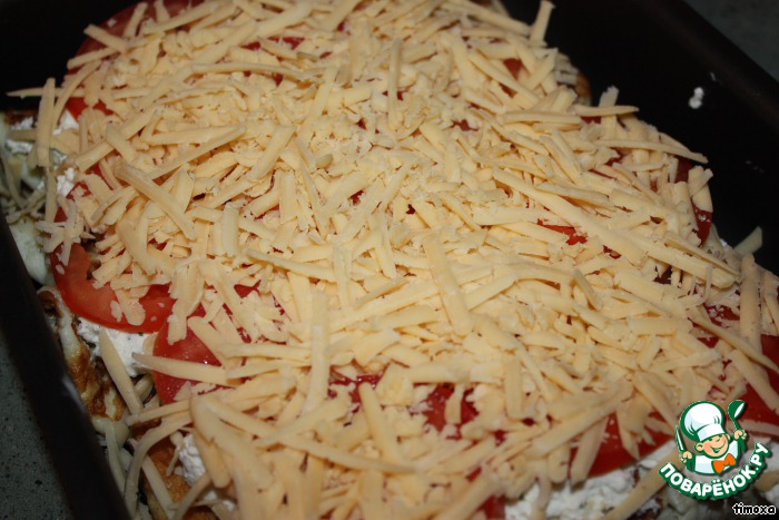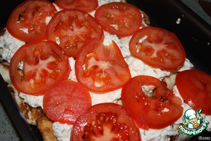 Рулетики выложить в смазанную форму. Сверху - слой творога, затем кружочки помидор.