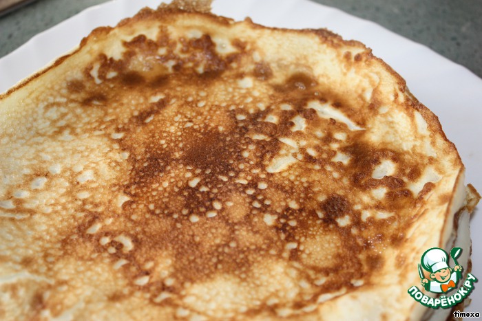 Выпекаем омлетные блинчики. Они будут немного по краям заворачиваться, когда их перевернем. У меня получилось 5 штук.