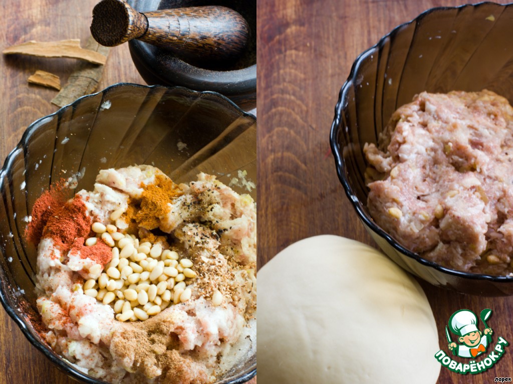 Для начинки - режем луковицу и обжариваем до золотистости в растительном масле. Слегка обжариваем кедровые орехи на другой сковороде. Добавляем кедровые орехи, красный и черный перцы, паприку, корицу и мускатный орех. В оригинальном рецепте фарш из баранины, у меня (да простят меня иорданцы, сирийцы и ливанцы!) смесь свинины с говядиной. Хорошо вымешиваем фарш.