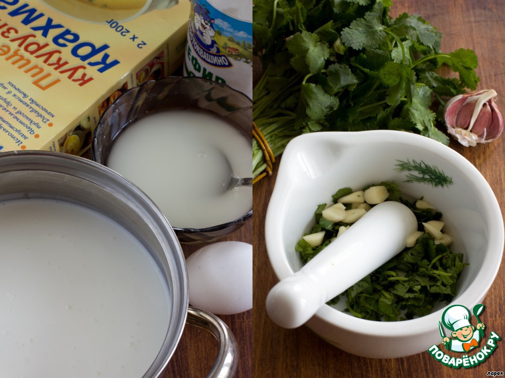 Начинаем готовить кефирный соус. В арабских странах готовят с лабаном или йогуртом. Кефир тоже подойдет, но он должен быть однородный, без крупинок. Для этого его можно слегка взбить погружным блендером, до гладкой консистенции, иначе готовый соус будет комковатый и неэстетичный. Налить кефир в сотейник. В миске смешать крахмал с водой, перемешать, добавить белок от яйца и слегка взбить вилкой, чтобы получилась однородная масса. Добавить в сотейник к кефиру и снова тщательно перемешать. Соус готовить на среднем огне, непрерывно помешивая. В кипящий соус добавить щепотку соли (с солью осторожно, поскольку еще будет добавляться соленая кинза с чесноком. Лучше потом немного досолить). Приготовить кинзу, чеснок, соль и ступку.