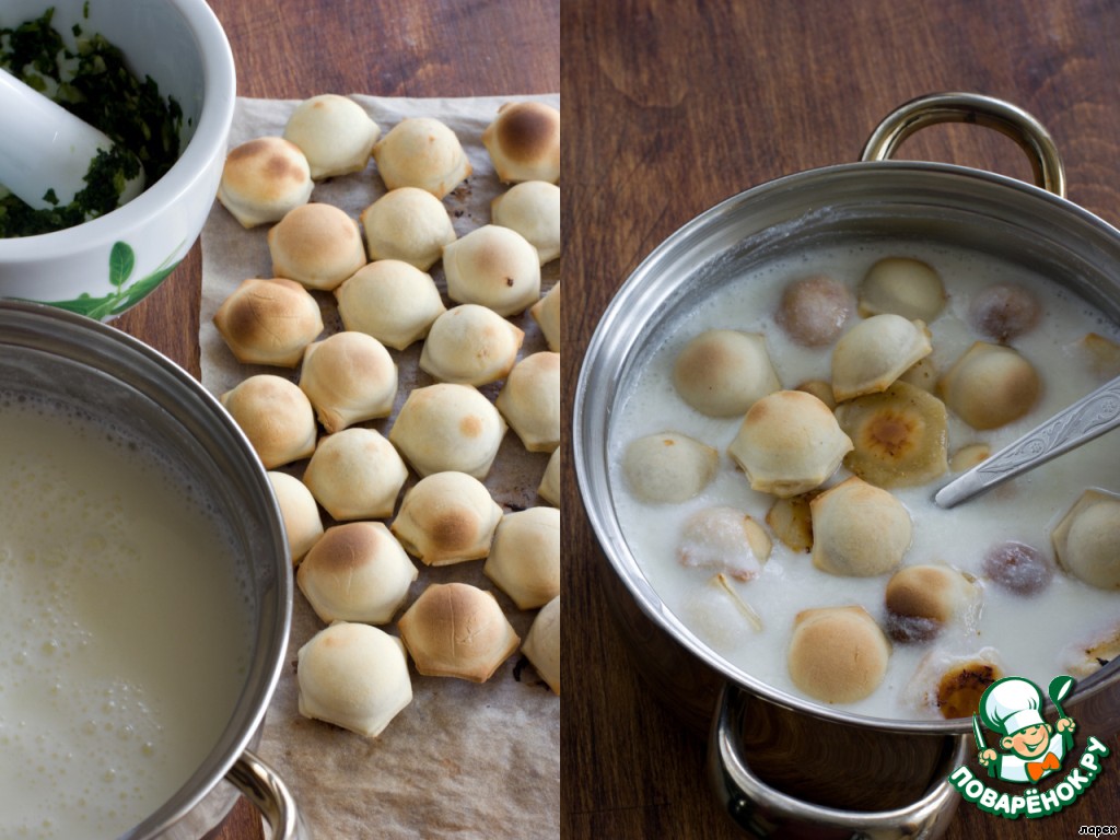 | Меня название настолько заинтересовало, что, победив свою неприязнь к лепке пельменей, я не успокоилась, пока не приготовила это блюдо. Вы только вдумайтесь - запеченные (!), а потом еще и отваренные в кефире... пельмени! Звучит, мягко скажем, непривычно, но готовить стОит! Однозначно! Рецепт elena_fialka, ЖЖ. |