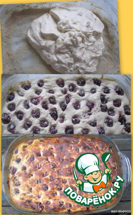сухарями огнеупорную посуду. Разложить вишни, вдавить поглубже и