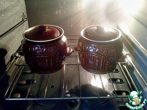 Ставим горшочки в разогретую духовку на огонь меньше среднего ( у меня нет термометра, к сожалению). Через полчаса начинает разноситься вкуснейший аромат, через час мясо готово, но я держу плюс 10-15 минут, что бы свинина "таяла" во рту.