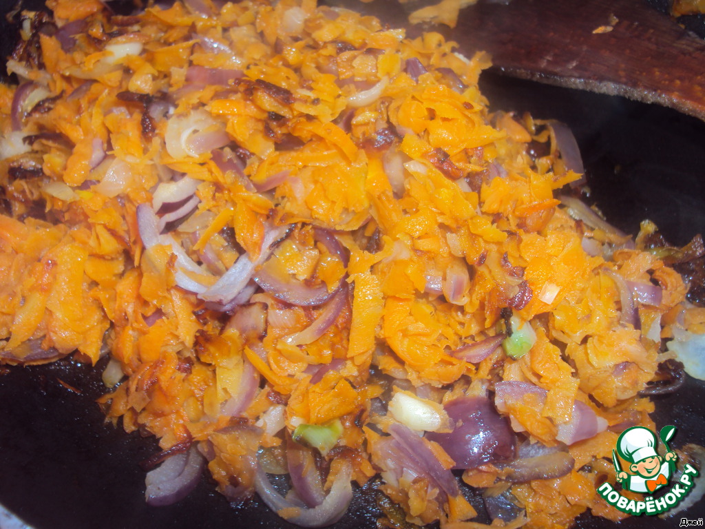 Морковку натираем на крупной тёрке, лук режем крупными кубиками и обжариваем всё на растительном масле до золотистого цвета.