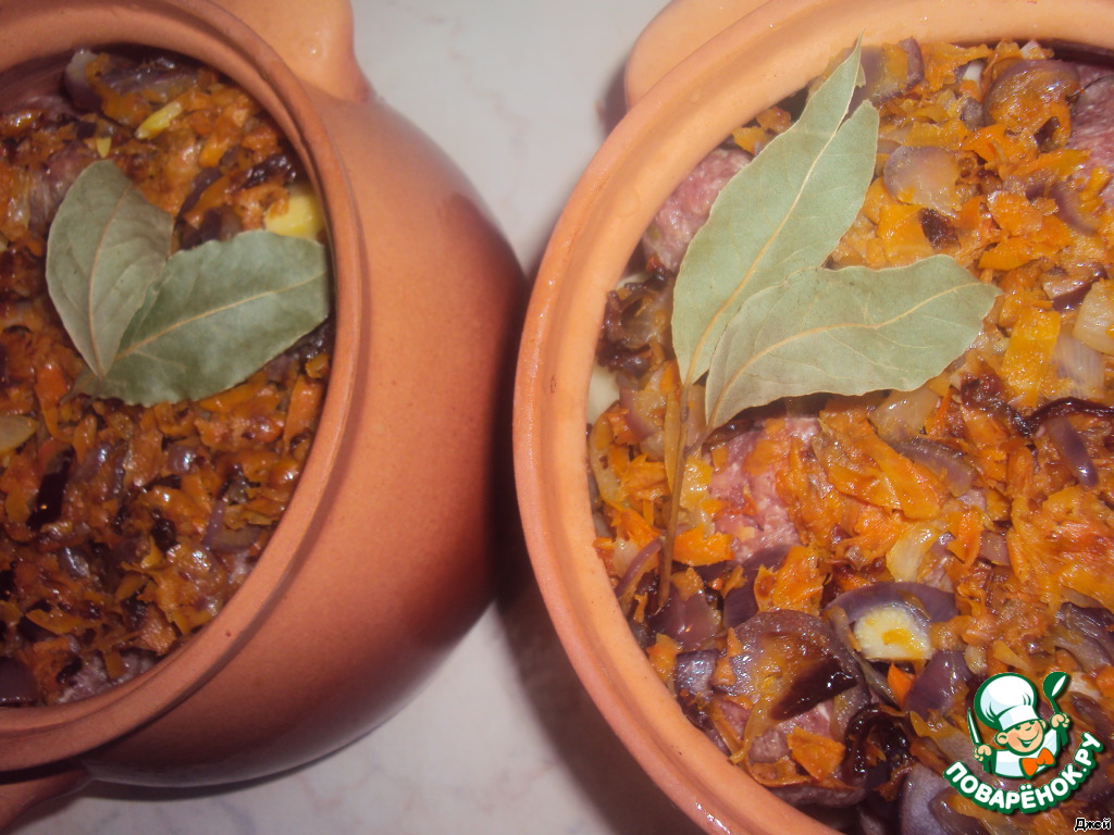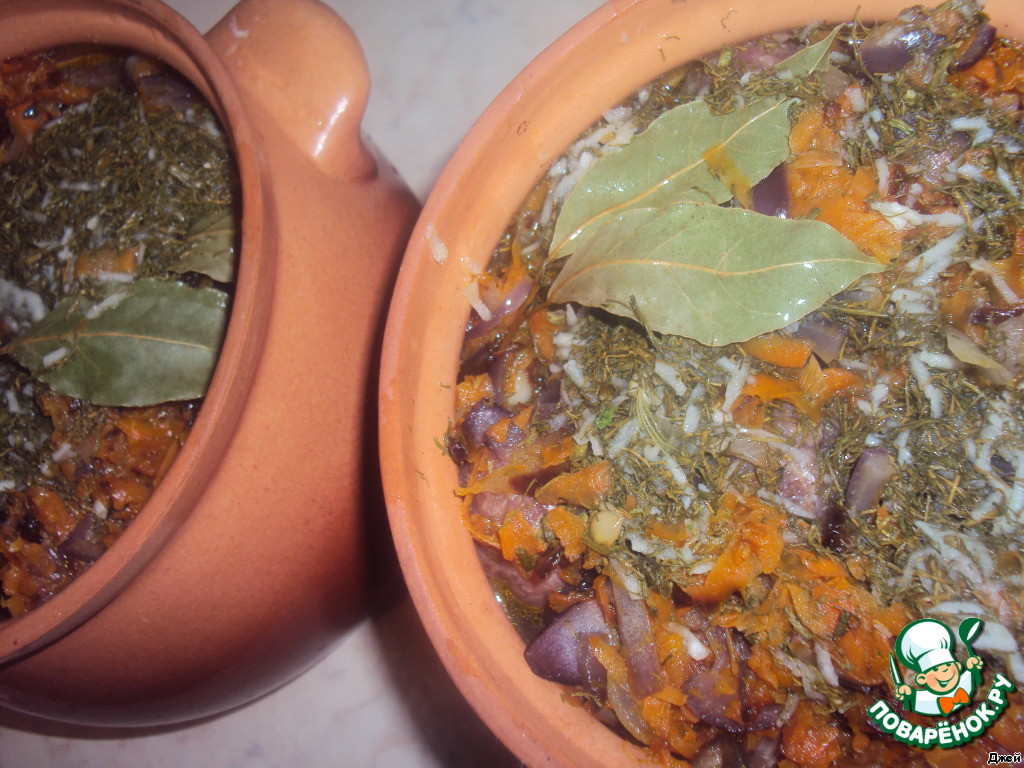И сверху прикрываем "одеялком" из жареных овощей и пару листочков лаврового листа.