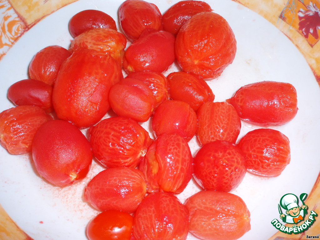 В ту же воду положить помидоры и подождать, когда лопнет кожура. Выловить её и очистить помидоры, раздавить вилкой.