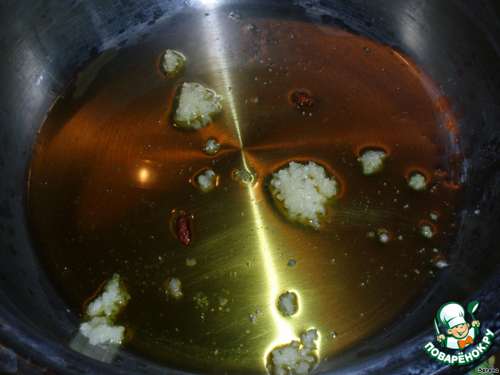 В раскалённое масло выдавить чеснок и положить перчик. Не поджаривать чеснок, а лишь дать ему нагреться до выделения аромата.