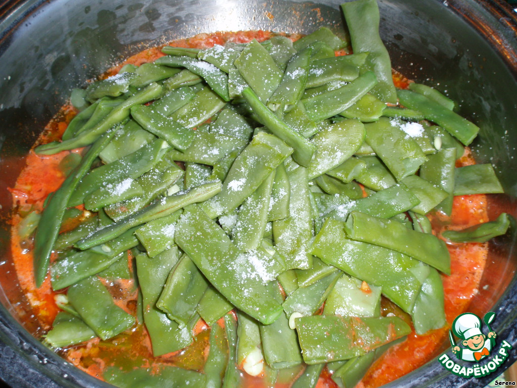 Фасоль очистить, промыть и поместить в кипящую солёную воду. Варить около 15 минут (зависит от размера)