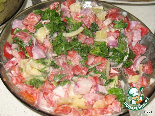 Режем мелко помидоры, лук, сладкий перец. Добавляем мелко нарубленные зубчик чеснока и зелень. Заправляем майонезом, перемешиваем.