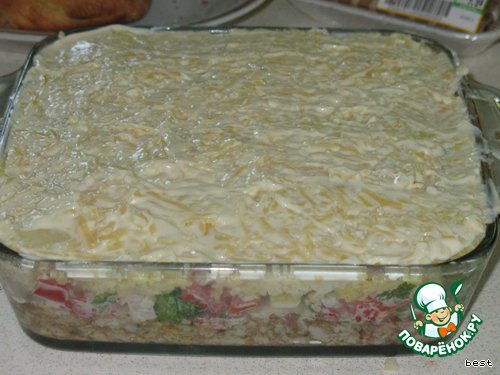 Затем натираем сыр, перемешиваем его с майонезом (можно ещё и чесночка добавить, но это на любителя).