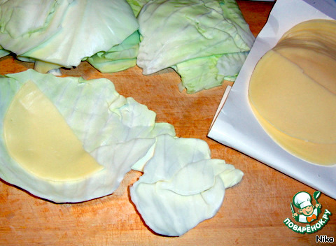 Капустный лист разрываю на две части. Сырный ломтик - так же.