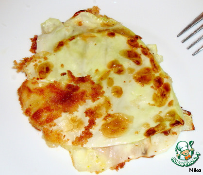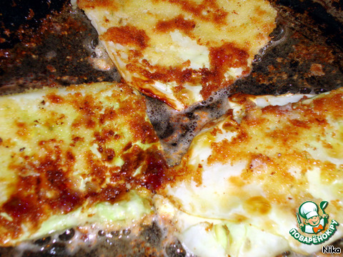 Заворачиваю в половину листа половинку сыра. Придавливаю рукой, чтобы блин был плоский. Обмакиваю в яйце с солёной приправой (можно добавить и перец) и обжариваю в разогретой сковороде на масле.