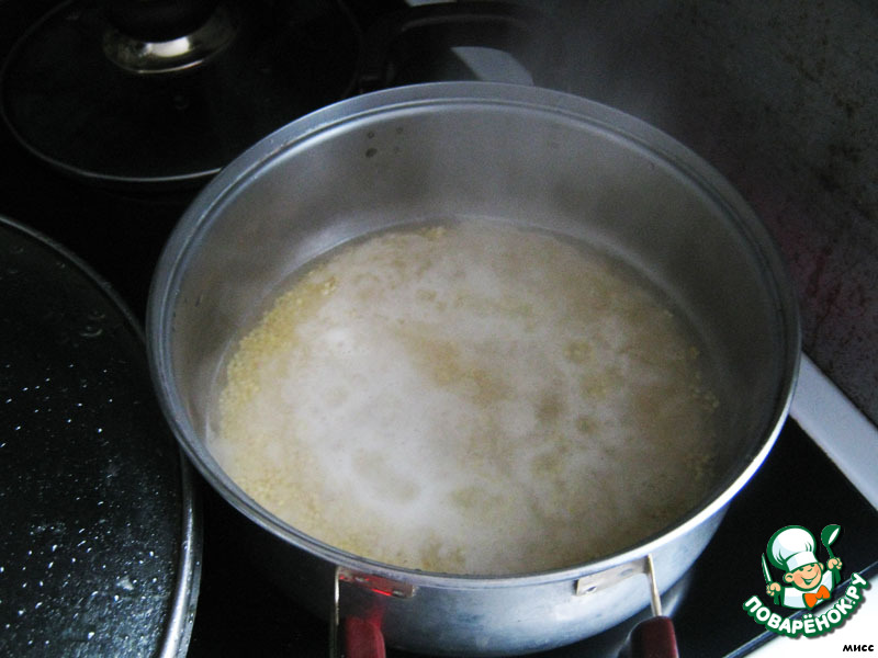 Если честно, то я не фанатка пшена. Но бывает такое, что увидела рецепт и захотела его приготовить, и неожиданно понравился. Вообще, эти биточки лучше готовить из уже сваренной заранее пшённой каши. Но не имея таковой, берём пшено, заливаем водой, доводим до кипения и варим на медленном огне 10-12 минут, далее солим, добавляем молоко и продолжаем варить до готовности.