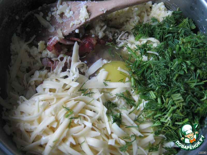 К каше добавляем укроп, натёртый сыр, яйцо.