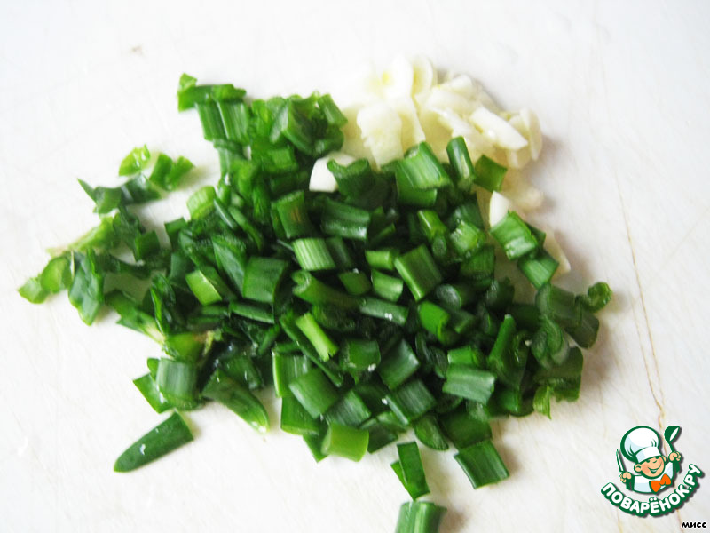 Для этого мелко нарезаем чеснок, зелёный лук и перемешиваем со сметаной или йогуртом.