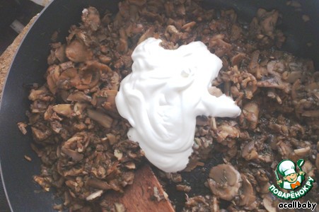Грибы и лук мелко порезать, обжарить (я жарю без масла на тефлоновой сковородке). Когда выпарится ненужная жидкость, добавить рубленый укроп, сметану и специи по вкусу. Протушить минут 5.