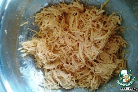 Картофель потереть на мелкой терке, посолить, добавить яйца, муку, выдавить чеснок.