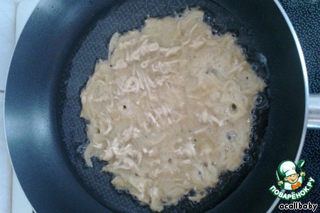 Разогреть сковороду, добавить подсолнечное масло. Сформировать на сковороде тонкий блин из картофеля. Обжарить с каждой стороны по 3-4 минуты.