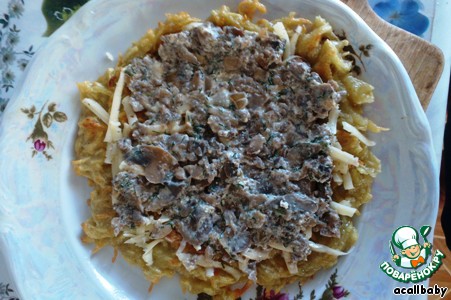 Когда картофельный блин готов, промокнуть его хорошенько бумажной салфеткой, чтобы убрать лишний жир. На блин выложить тертый сыр, а сверху - нашу начинку из грибов.