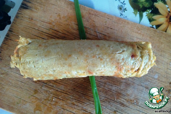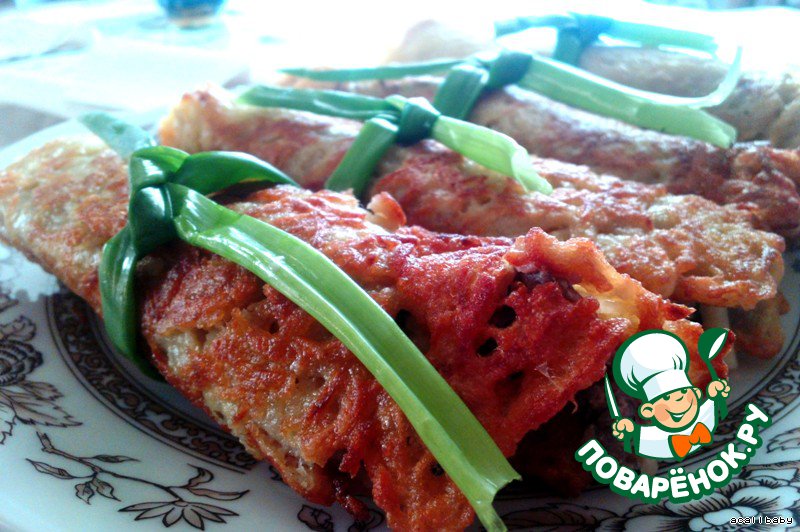 Свернуть картофельный блин рулетом (скручивается он довольно легко, не ломается), можно связать перышком зеленого лука.