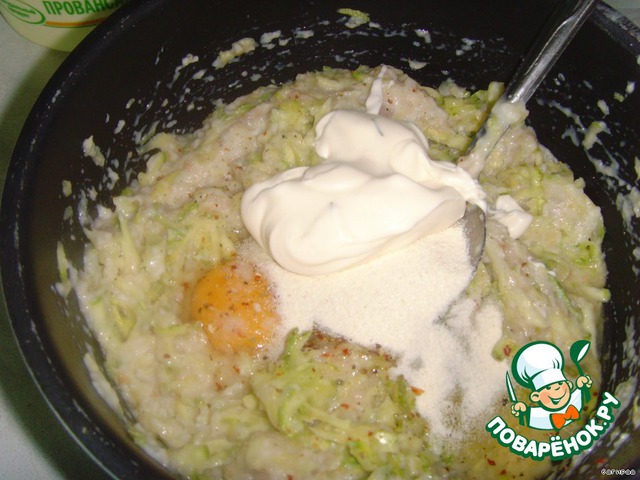 Добавить 2 ст. л. майонеза, 2 ст. л. манки, посолить, поперчить,