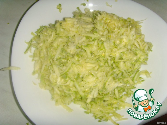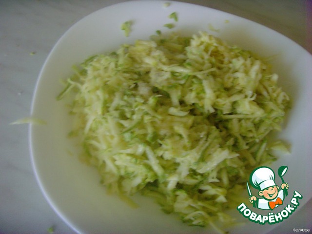 Кабачок натереть на крупной терке, посолить, дать постоять минут 15, отжать сок.