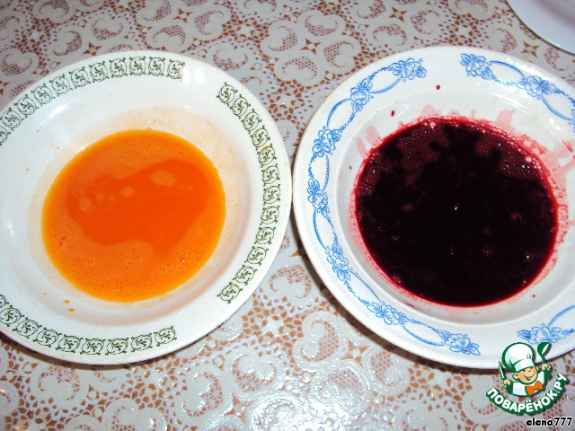 Рис отварить в подсоленной воде, откинуть на дуршлаг, промыть холодной водой и подсушить. Отжать в разную посуду сок моркови и свеклы. Я натёрла овощи на мелкой тёрке и отжала сок через марлечку.