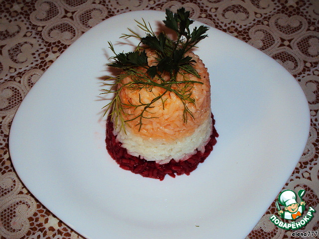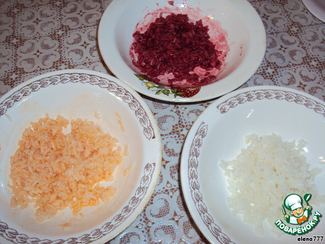 Рис разделить на 3 части. Одну оставить белой, в другую добавить сок моркови, а в третью - сок свёклы.