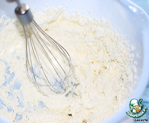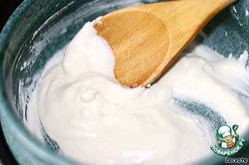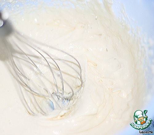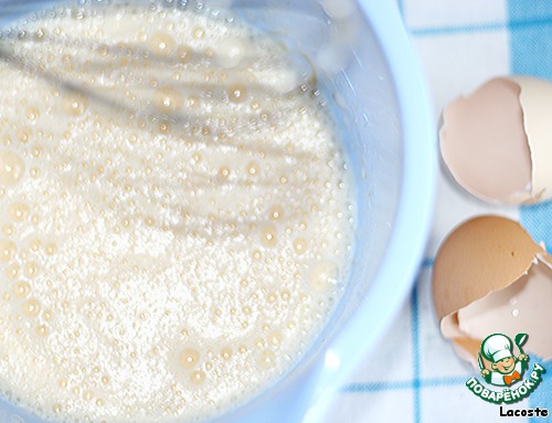 Яйцо взбить с сахарной пудрой до белой пышной массы.
