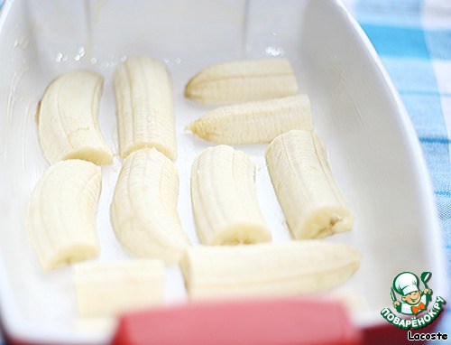 Огнеупорную форму смазать сливочным маслом и присыпать мукой. Выложить нарезанные бананы.