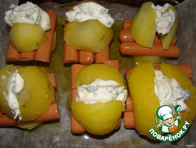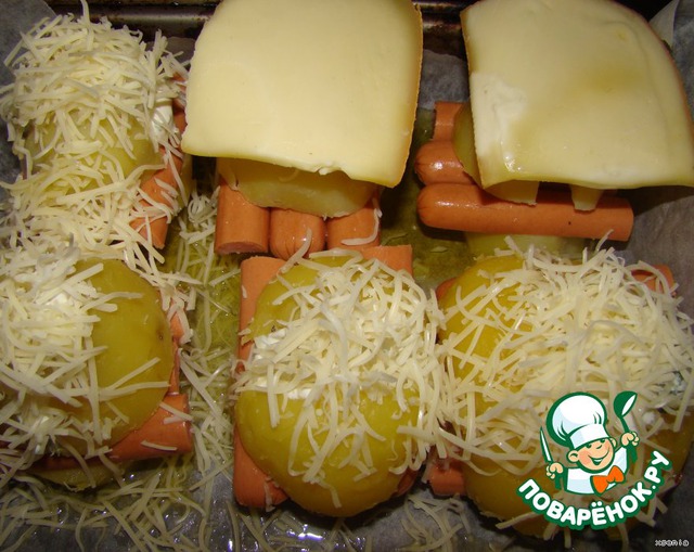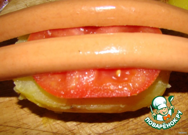 Второй вариант..под сосиски положить кружок помдора..посолить поперчить...посыпать сыром..накрыть дольками картофеля..Дальше тоже самое